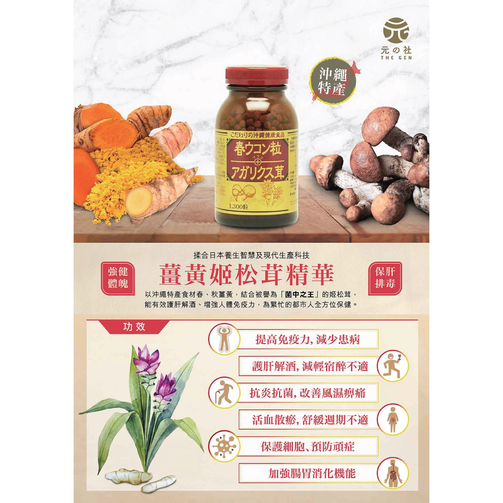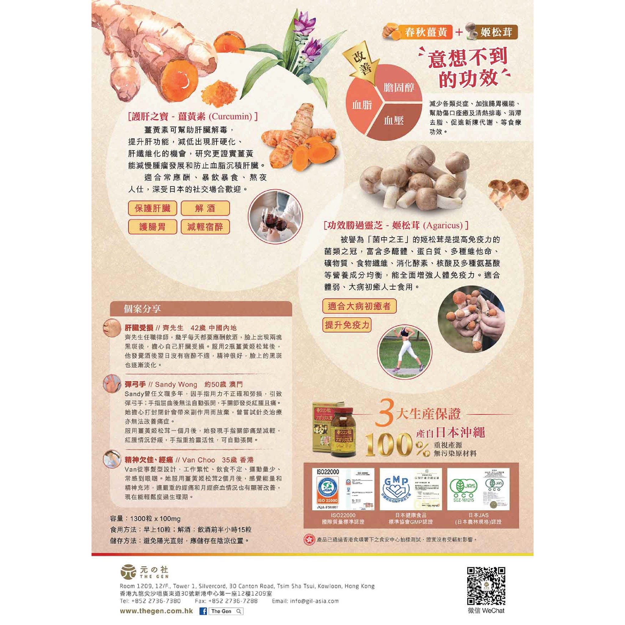 ・揉合日本養生智慧及現代生產科技,以沖繩特產食材春、秋薑黃,結合被譽為「菌中之王」的姬松茸,能有效護肝解酒、增強人體免疫力,維持繁忙的都市人每一天的肝臟健康。